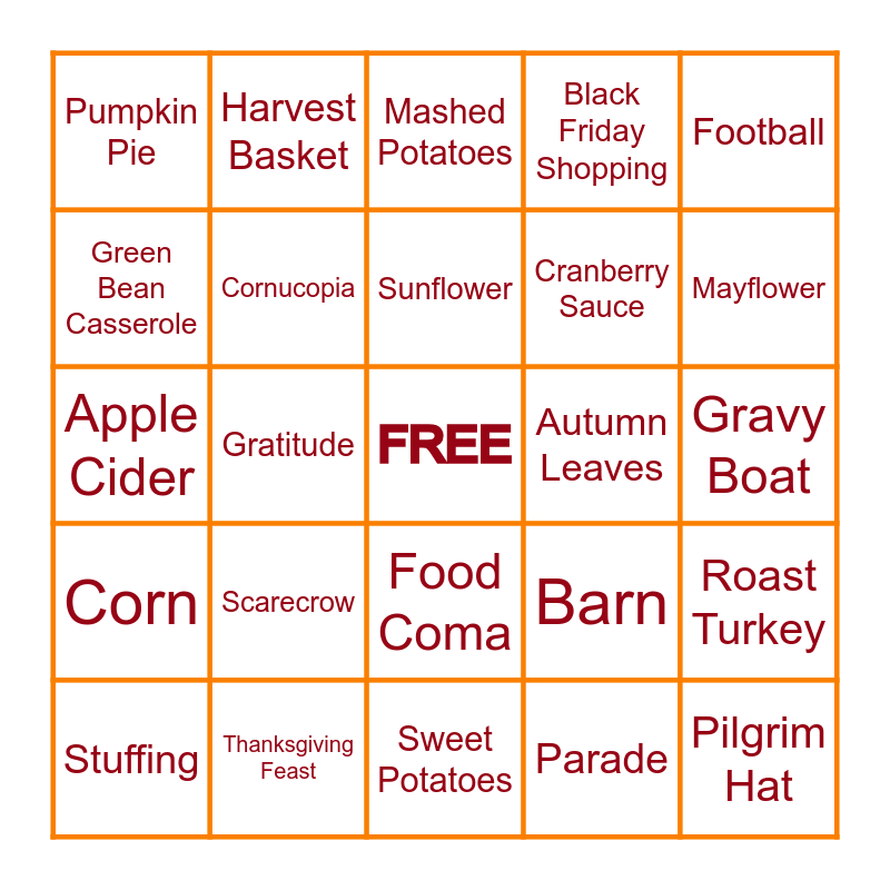 This bingo card has a free space and 24 words: Scarecrow, Thanksgiving Feast, Sunflower, Stuffing, Football, Pumpkin Pie, Green Bean Casserole, Harvest Basket, Autumn Leaves, Food Coma, Cranberry Sauce, Apple Cider, Barn, Roast Turkey, Cornucopia, Parade, Gravy Boat, Mashed Potatoes, Mayflower, Gratitude, Pilgrim Hat, Corn, Black Friday Shopping and Sweet Potatoes.