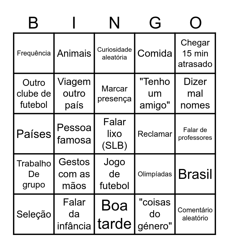 This bingo card has a free space and 48 words: Jogar Clash Royale, Comentário aleatório, Sair com foguete no cu, Boa tarde, Gestos com as mãos, "Como vocês devem saber", Animais, 12 anos Engenharia civil, Outro clube de futebol, Polo, Viagem outro país, Comida, Brasil, Olimpíadas, Desporto aleatório, Iscac, Marcar presença, Reclamar, Mudança de hora, Chegar 15 min atrasado, Pessoa famosa, "coisas do género", Frequência, "Tenho um amigo", Bebida alcoólicas/ tabaco, Dizer mal nomes, Seleção, Expressão em inglês, Jogo de futebol, Trabalho De grupo, "No meu tempo", "lembro-me...", Férias, Bons alunos, Falar da infância, Prémio, História de amigos, Falar de professores, "É evidente...", Profissão, Jogador de futebol, "(...), não é?", Curiosidade aleatória, Religião, Países, História, Automóveis and Comparar Portugal com outro país.