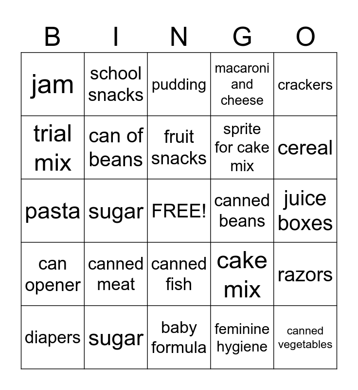 This bingo card has a free space and 44 words: tooth brush, canned vegetables, shampoo/ conditioner, diapers, oil, feminine hygiene, pudding, oatmeal, crackers, sugar, macaroni and cheese, canned beans, canned fish, canned meat, canned soup, baby formula, rice, pasta, pasta sauce, cereal, school snacks, pancake mix, peanut butter, jam, canned fruit, juice boxes, apple sauce, body wash, cake mix, can opener, dried fruit, razors, chips, flour, sugar, cooking oil, jelly or jam, jello, fruit snacks, trial mix, sprite for cake mix, cake mix, can of beans and chocolate chips.