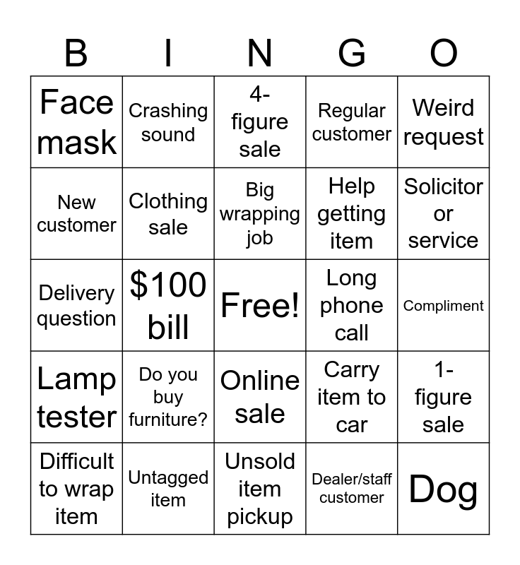 This bingo card has a free space and 24 words: Do you buy furniture?, Untagged item, Big wrapping job, Difficult to wrap item, Weird request, Face mask, New customer, Crashing sound, Long phone call, Online sale, Help getting item, Delivery question, Carry item to car, 1-figure sale, Clothing sale, Dealer/staff customer, Compliment, 4-figure sale, Solicitor or service, $100 bill, Dog, Lamp tester, Regular customer and Unsold item pickup.