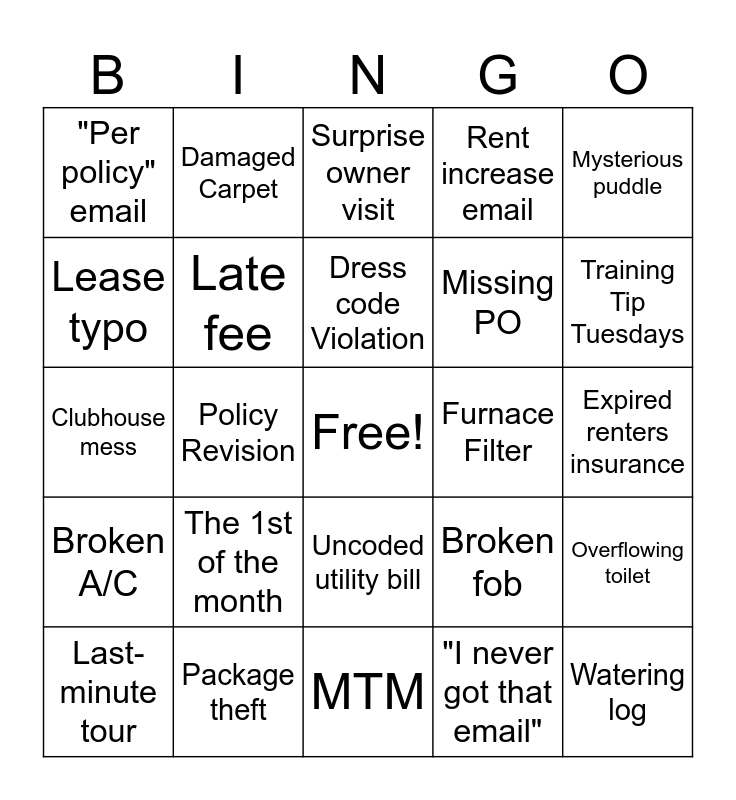 This bingo card has a free space and 24 words: The 1st of the month, Package theft, Dress code Violation, Last-minute tour, Mysterious puddle, "Per policy" email, Lease typo, Damaged Carpet, Furnace Filter, Uncoded utility bill, Missing PO, Clubhouse mess, Broken fob, Overflowing toilet, Late fee, "I never got that email", Expired renters insurance, Surprise owner visit, Training Tip Tuesdays, Policy Revision, Watering log, Broken A/C, Rent increase email and MTM.