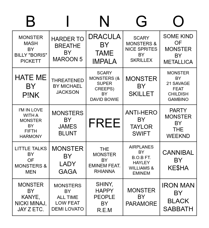 This bingo card has a free space and 25 words: MONSTER BY LADY GAGA, SHINY, HAPPY PEOPLE BY R.E.M, SCARY MONSTERS (& SUPER CREEPS) BY DAVID BOWIE, MONSTER BY KANYE, NICKI MINAJ, JAY Z ETC., SOME KIND OF MONSTER BY METALLICA, MONSTER MASH BY BILLY "BORIS" PICKETT, HATE ME BY P!NK, HARDER TO BREATHE BY MAROON 5, ANTI-HERO BY TAYLOR SWIFT, THE MONSTER BY EMINEM FEAT. RHIANNA, MONSTER BY SKILLET, I'M IN LOVE WITH A MONSTER BY FIFTH HARMONY, AIRPLANES BY B.O.B FT. HAYLEY WILLIAMS & EMINEM, CANNIBAL BY KE$HA, THREATENED BY MICHAEL JACKSON, MONSTER BY JUSTIN BIEBER & SHAWN MENDEZ, PARTY MONSTER BY THE WEEKND, DRACULA BY TAME IMPALA, MONSTER BY 21 SAVAGE FEAT CHILDISH GAMBINO, MONSTERS BY JAMES BLUNT, IRON MAN BY BLACK SABBATH, MONSTERS BY ALL TIME LOW FEAT DEMI LOVATO, LITTLE TALKS BY OF MONSTERS & MEN, SCARY MONSTERS & NICE SPRITES BY SKRILLEX and MONSTER BY PARAMORE.