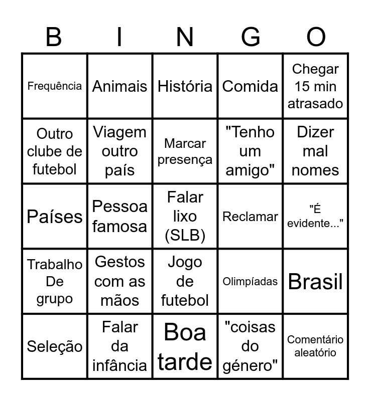 This bingo card has a free space and 49 words: Jogar Clash Royale, Comentário aleatório, Sair com foguete no cu, Boa tarde, Gestos com as mãos, "Como vocês devem saber", Animais, 12 anos Engenharia civil, Outro clube de futebol, Polo, Viagem outro país, Comida, Brasil, Olimpíadas, Desporto aleatório, Iscac, Marcar presença, Reclamar, Mudança de hora, Chegar 15 min atrasado, Pessoa famosa, "coisas do género", Frequência, "Tenho um amigo", Bebida alcoólicas/ tabaco, Dizer mal nomes, Seleção, Expressão em inglês, Jogo de futebol, Trabalho De grupo, "No meu tempo", "lembro-me...", Férias, Bons alunos, Falar da infância, Prémio, História de amigos, Falar de professores, "É evidente...", Profissão, Jogador de futebol, "(...), não é?", Curiosidade aleatória, Religião, Países, História, Automóveis, Comparar Portugal com outro país and Política.