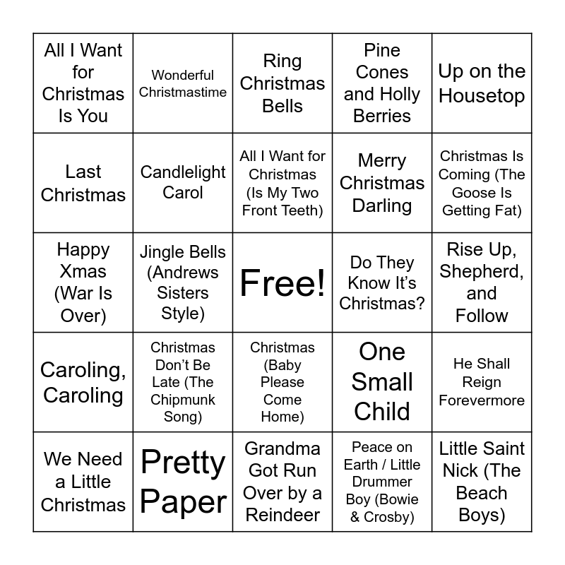 This bingo card has a free space and 25 words: Christmas Don’t Be Late (The Chipmunk Song), Grandma Got Run Over by a Reindeer, All I Want for Christmas (Is My Two Front Teeth), We Need a Little Christmas, Up on the Housetop, All I Want for Christmas Is You, Last Christmas, Wonderful Christmastime, Do They Know It’s Christmas?, Christmas (Baby Please Come Home), Merry Christmas Darling, Happy Xmas (War Is Over), One Small Child, He Shall Reign Forevermore, Candlelight Carol, Star of the East, Rise Up, Shepherd, and Follow, Ring Christmas Bells, Christmas Is Coming (The Goose Is Getting Fat), Jingle Bells (Andrews Sisters Style), Little Saint Nick (The Beach Boys), Pretty Paper, Caroling, Caroling, Pine Cones and Holly Berries and Peace on Earth / Little Drummer Boy (Bowie & Crosby).