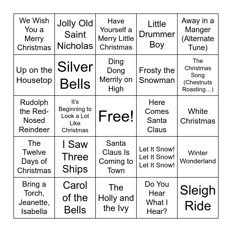 This bingo card has a free space and 25 words: I Saw Three Ships, The Holly and the Ivy, Ding Dong Merrily on High, Bring a Torch, Jeanette, Isabella, Away in a Manger (Alternate Tune), We Wish You a Merry Christmas, Up on the Housetop, Jolly Old Saint Nicholas, Here Comes Santa Claus, Santa Claus Is Coming to Town, Frosty the Snowman, Rudolph the Red-Nosed Reindeer, Let It Snow! Let It Snow! Let It Snow!, Winter Wonderland, Silver Bells, I’ll Be Home for Christmas, White Christmas, Have Yourself a Merry Little Christmas, The Christmas Song (Chestnuts Roasting…), It’s Beginning to Look a Lot Like Christmas, Sleigh Ride, Carol of the Bells, The Twelve Days of Christmas, Little Drummer Boy and Do You Hear What I Hear?.
