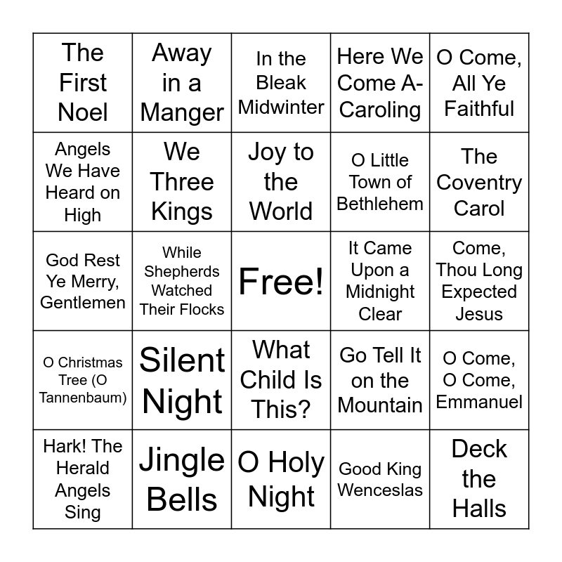 This bingo card has a free space and 25 words: Silent Night, O Holy Night, Joy to the World, Hark! The Herald Angels Sing, O Come, All Ye Faithful, The First Noel, Angels We Have Heard on High, Away in a Manger, It Came Upon a Midnight Clear, What Child Is This?, O Little Town of Bethlehem, God Rest Ye Merry, Gentlemen, Go Tell It on the Mountain, O Come, O Come, Emmanuel, We Three Kings, Once in Royal David’s City, Come, Thou Long Expected Jesus, In the Bleak Midwinter, The Coventry Carol, While Shepherds Watched Their Flocks, Deck the Halls, Jingle Bells, O Christmas Tree (O Tannenbaum), Here We Come A-Caroling and Good King Wenceslas.