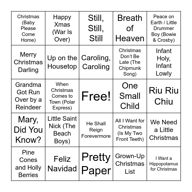 This bingo card has a free space and 25 words: Little Saint Nick (The Beach Boys), Pretty Paper, Caroling, Caroling, Pine Cones and Holly Berries, Peace on Earth / Little Drummer Boy (Bowie & Crosby), Christmas (Baby Please Come Home), Merry Christmas Darling, Happy Xmas (War Is Over), One Small Child, He Shall Reign Forevermore, Christmas Don’t Be Late (The Chipmunk Song), Grandma Got Run Over by a Reindeer, All I Want for Christmas (Is My Two Front Teeth), We Need a Little Christmas, Up on the Housetop, Masters in This Hall, Riu Riu Chiu, Still, Still, Still, Infant Holy, Infant Lowly, When Christmas Comes to Town (Polar Express), I Want a Hippopotamus for Christmas, Feliz Navidad, Mary, Did You Know?, Breath of Heaven and Grown-Up Christmas List.