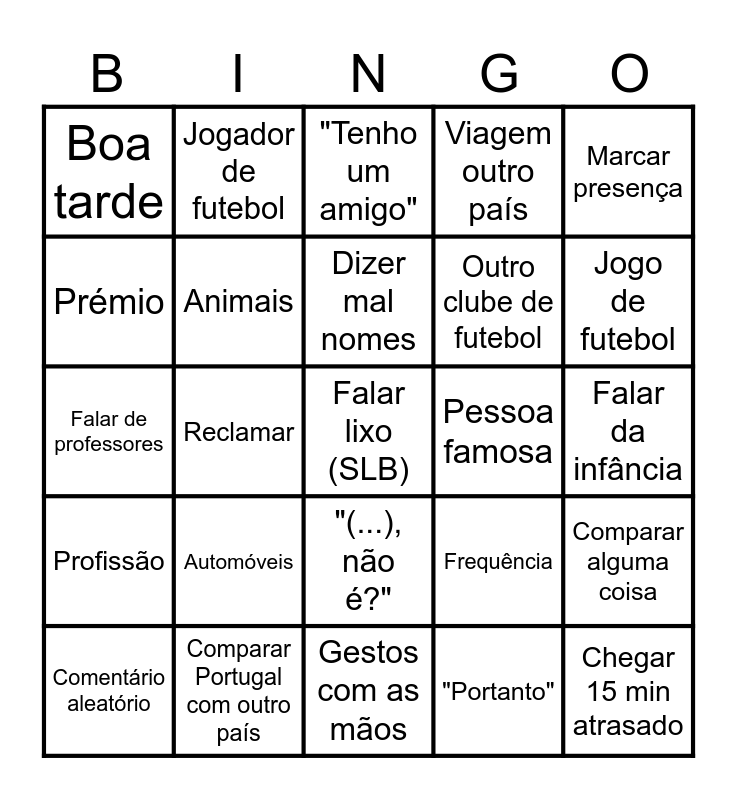 This bingo card has a free space and 57 words: Jogar Clash Royale, Comentário aleatório, Sair com foguete no cu, Boa tarde, Gestos com as mãos, "Como vocês devem saber", Animais, 12 anos Engenharia civil, Outro clube de futebol, Polo, Viagem outro país, Comida, Brasil, Olimpíadas, Desporto aleatório, Iscac, Marcar presença, Reclamar, Tempo, Chegar 15 min atrasado, Pessoa famosa, "coisas do género", Frequência, "Tenho um amigo", Bebida alcoólicas/ tabaco, Dizer mal nomes, Seleção, Expressão em inglês, Jogo de futebol, Trabalho De grupo, "No meu tempo", "lembro-me...", Férias, Bons alunos, Falar da infância, Prémio, História de amigos, Falar de professores, "É evidente...", Profissão, Jogador de futebol, "(...), não é?", Curiosidade aleatória, Religião, Países, História, Automóveis, Comparar Portugal com outro país, Política, "Valor significativo", "eventualmente", "Portanto", "obviamente", Outra língua, Escola, Comparar alguma coisa and "de facto".