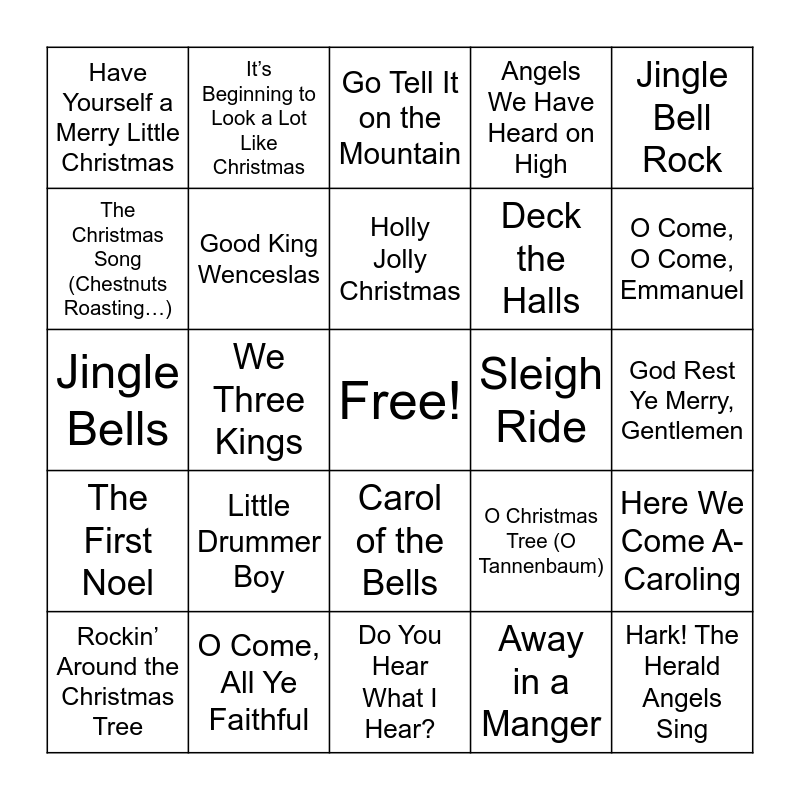 This bingo card has a free space and 25 words: Little Drummer Boy, Do You Hear What I Hear?, Holly Jolly Christmas, Rockin’ Around the Christmas Tree, Jingle Bell Rock, Have Yourself a Merry Little Christmas, The Christmas Song (Chestnuts Roasting…), It’s Beginning to Look a Lot Like Christmas, Sleigh Ride, Carol of the Bells, Deck the Halls, Jingle Bells, O Christmas Tree (O Tannenbaum), Here We Come A-Caroling, Good King Wenceslas, O Little Town of Bethlehem, God Rest Ye Merry, Gentlemen, Go Tell It on the Mountain, O Come, O Come, Emmanuel, We Three Kings, Hark! The Herald Angels Sing, O Come, All Ye Faithful, The First Noel, Angels We Have Heard on High and Away in a Manger.