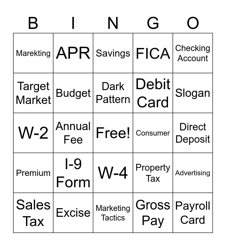 This bingo card has a free space and 32 words: Gross Pay, Net Pay, Annual Fee, Credit Score, Premium, Budget, Checking Account, Advertising, APR, Interest, Dark Pattern, Savings, Credit Card, Scarcity, Consumer, Debt, Sales Tax, W-2, W-4, I-9 Form, Property Tax, Military, Direct Deposit, Excise, Payroll Card, FICA, Debit Card, Target Market, Marekting, Marketing Tactics, Brand and Slogan.