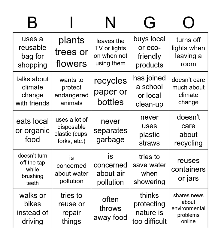 This bingo card has 25 words: is concerned about water pollution, often throws away food, recycles paper or bottles, walks or bikes instead of driving, turns off lights when leaving a room, uses a reusable bag for shopping, talks about climate change with friends, plants trees or flowers, never uses plastic straws, is concerned about air pollution, has joined a school or local clean-up, eats local or organic food, tries to save water when showering, reuses containers or jars, wants to protect endangered animals, shares news about environmental problems online, doesn't care about recycling, leaves the TV or lights on when not using them, doesn’t care much about climate change, uses a lot of disposable plastic (cups, forks, etc.), never separates garbage, tries to reuse or repair things, doesn’t turn off the tap while brushing teeth, buys local or eco-friendly products and thinks protecting nature is too difficult.