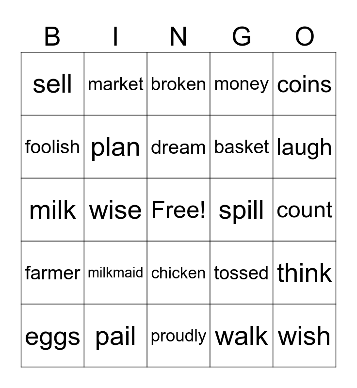 This bingo card has a free space and 24 words: milkmaid, pail, dream, eggs, coins, sell, foolish, market, spill, chicken, basket, milk, tossed, think, plan, walk, count, broken, laugh, wise, wish, farmer, money and proudly.