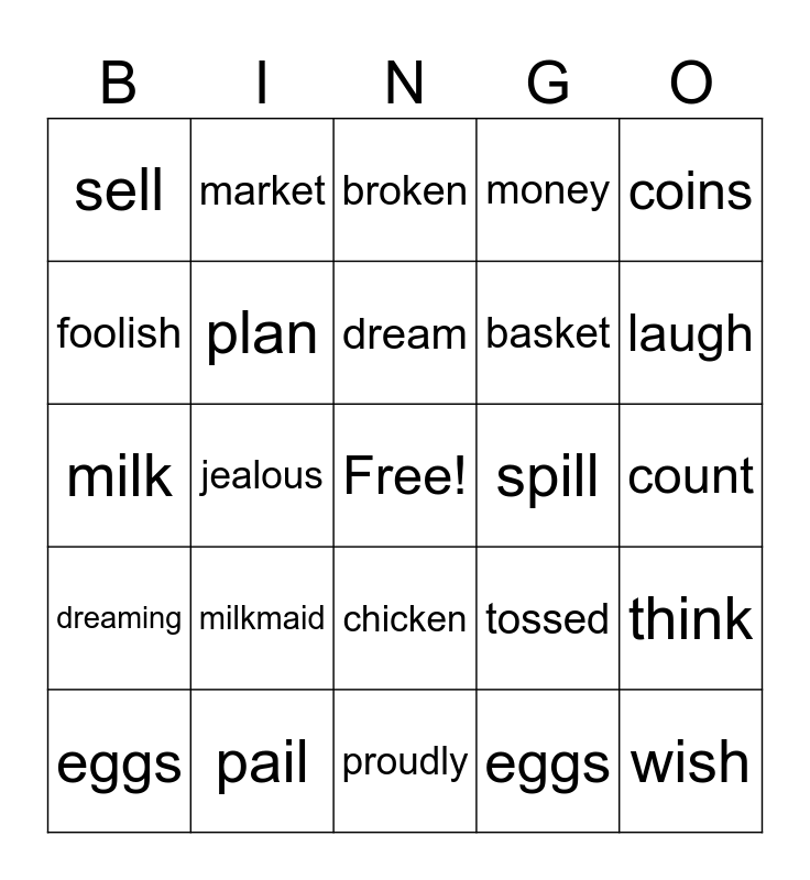This bingo card has a free space and 24 words: milkmaid, pail, dream, eggs, coins, sell, foolish, market, spill, chicken, basket, milk, tossed, think, plan, eggs, count, broken, laugh, jealous, wish, dreaming, money and proudly.