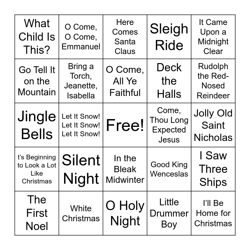 This bingo card has a free space and 25 words: Silent Night, O Holy Night, O Come, All Ye Faithful, The First Noel, It Came Upon a Midnight Clear, What Child Is This?, Go Tell It on the Mountain, O Come, O Come, Emmanuel, Come, Thou Long Expected Jesus, In the Bleak Midwinter, Deck the Halls, Jingle Bells, Good King Wenceslas, I Saw Three Ships, Bring a Torch, Jeanette, Isabella, Away in a Manger (Alternate Tune), Jolly Old Saint Nicholas, Here Comes Santa Claus, Rudolph the Red-Nosed Reindeer, Let It Snow! Let It Snow! Let It Snow!, I’ll Be Home for Christmas, White Christmas, t’s Beginning to Look a Lot Like Christmas, Sleigh Ride and Little Drummer Boy.