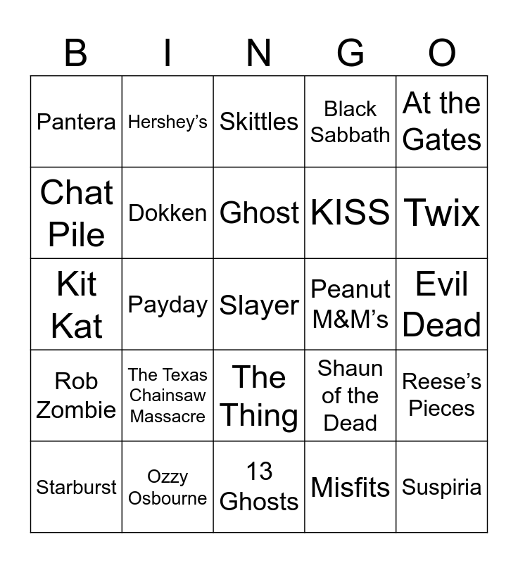 This bingo card has 60 words: Iron Maiden, Ozzy Osbourne, Metallica, Rob Zombie, Misfits, Death, Dokken, Avenged Sevenfold, KISS, Alice Cooper, Black Sabbath, Cannibal Corpse, Chat Pile, Judas Priest, Motley Crue, Pantera, Slayer, At the Gates, The Used, Ghost, Peanut M&M’s, Skittles, Starburst, Reese’s Pieces, Nerds, Mike & Ike, Milky Way, 3 Musketeer, Twix, Mounds, Almond Joy, Snickers, Trolli, Sour Patch Kids, Hershey’s, Crunch, Butterfinger, Payday, Heath, Kit Kat, Psycho, The Texas Chainsaw Massacre, Evil Dead, Hellraiser, Shaun of the Dead, The Blair Witch Project, The Shining, Friday the 13th, Elm Street, The Thing, 13 Ghosts, Poltergeist, The Babadook, Child’s Play, From Dusk til Dawn, Saw, The Strangers, IT, Suspiria and The Faculty.