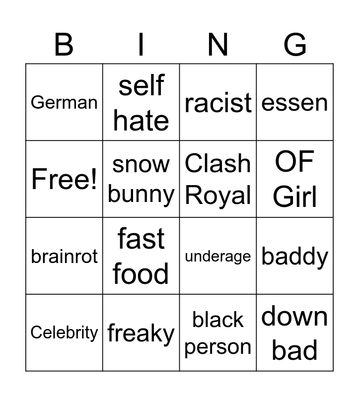 This bingo card has 16 words: freaky, baddy, racist, German, brainrot, self hate, underage, black person, Free!, snow bunny, Celebrity, essen, fast food, OF Girl, Clash Royal and down bad.