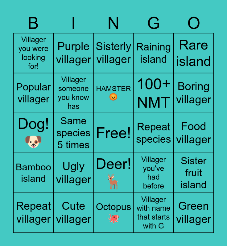 This bingo card has a free space and 24 words: Ugly villager, Cute villager, HAMSTER 😡, Repeat villager, Rare island, Villager you were looking for!, Popular villager, Purple villager, Repeat species, Deer! 🦌, 100+ NMT, Dog! 🐶, Villager you've had before, Sister fruit island, Villager someone you know has, Villager with name that starts with G, Food villager, Sisterly villager, Boring villager, Same species 5 times, Green villager, Bamboo island, Raining island and Octopus 🐙.