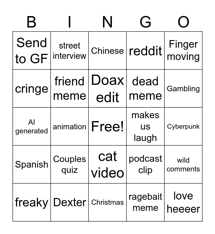 This bingo card has a free space and 24 words: Couples quiz, Dexter, Doax edit, freaky, Finger moving, Send to GF, cringe, street interview, makes us laugh, cat video, dead meme, AI generated, podcast clip, wild comments, friend meme, ragebait meme, Cyberpunk, Chinese, Gambling, animation, love heeeer, Spanish, reddit and Christmas.