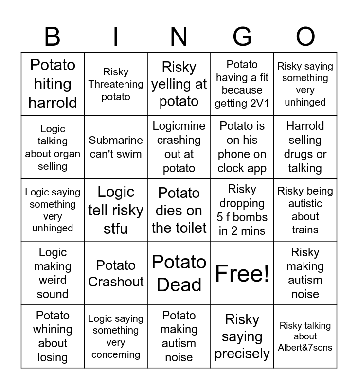 This bingo card has 25 words: Potato Crashout, Potato making autism noise, Logicmine crashing out at potato, Potato whining about losing, Risky saying something very unhinged, Potato hiting harrold, Logic talking about organ selling, Risky Threatening potato, Risky dropping 5 f bombs in 2 mins, Potato Dead, Potato is on his phone on clock app, Logic saying something very unhinged, Free!, Risky making autism noise, Submarine can't swim, Risky talking about Albert&7sons, Risky being autistic about trains, Risky yelling at potato, Harrold selling drugs or talking, Logic tell risky stfu, Potato dies on the toilet, Logic saying something very concerning, Logic making weird sound, Potato having a fit because getting 2V1 and Risky saying precisely.