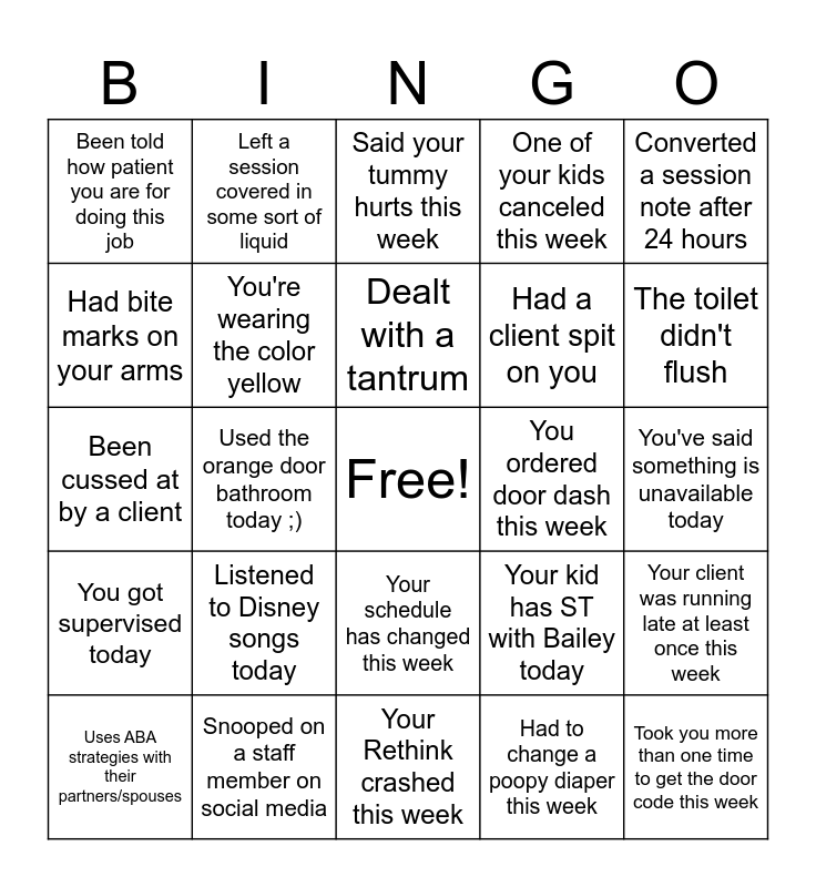 This bingo card has a free space and 24 words: Listened to Disney songs today, Snooped on a staff member on social media, Dealt with a tantrum, Uses ABA strategies with their partners/spouses, Converted a session note after 24 hours, Been told how patient you are for doing this job, Had bite marks on your arms, Left a session covered in some sort of liquid, You ordered door dash this week, Your schedule has changed this week, Had a client spit on you, Been cussed at by a client, Your kid has ST with Bailey today, Your client was running late at least once this week, You're wearing the color yellow, Had to change a poopy diaper this week, You've said something is unavailable today, Said your tummy hurts this week, The toilet didn't flush, Used the orange door bathroom today ;), Took you more than one time to get the door code this week, You got supervised today, One of your kids canceled this week and Your Rethink crashed this week.