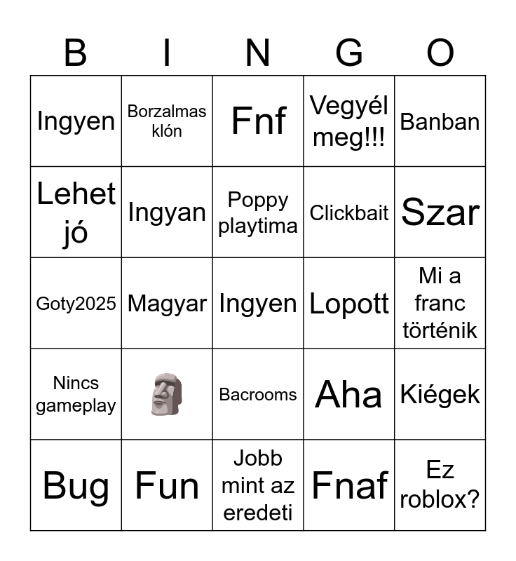This bingo card has a free space and 24 words: 馃椏, Fun, Poppy playtima, Bug, Banban, Ingyen, Lehet j贸, Borzalmas kl贸n, Lopott, Bacrooms, Clickbait, Goty2025, Aha, Ki茅gek, Ingyan, Fnaf, Mi a franc t枚rt茅nik, Fnf, Szar, Magyar, Ez roblox?, Nincs gameplay, Vegy茅l meg!!! and Jobb mint az eredeti.
