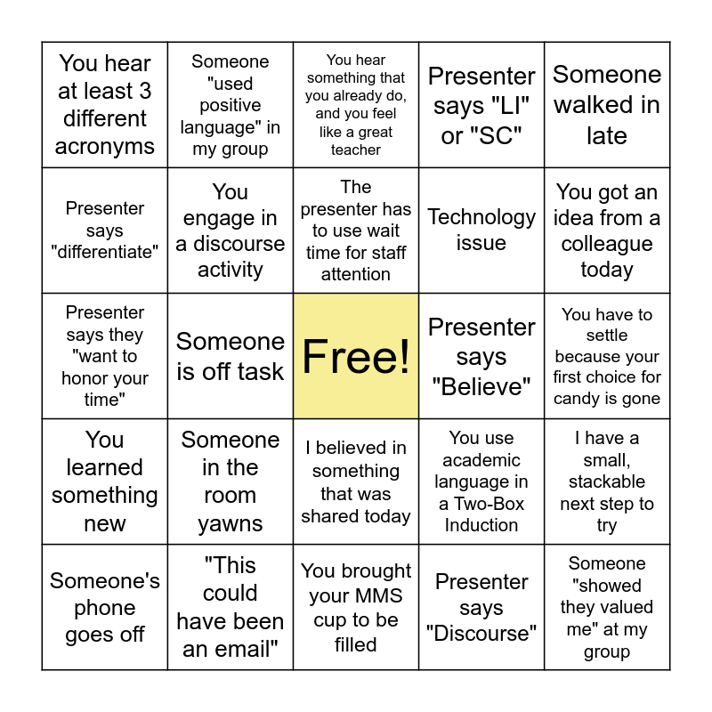 This bingo card has a free space and 24 words: Someone in the room yawns, "This could have been an email", The presenter has to use wait time for staff attention, Someone's phone goes off, Someone walked in late, You hear at least 3 different acronyms, Presenter says "differentiate", Someone "used positive language" in my group, Presenter says "Believe", I believed in something that was shared today, Technology issue, Presenter says they "want to honor your time", You use academic language in a Two-Box Induction, I have a small, stackable next step to try, You engage in a discourse activity, Presenter says "Discourse", You have to settle because your first choice for candy is gone, You hear something that you already do, and you feel like a great teacher, You got an idea from a colleague today, Someone is off task, Someone "showed they valued me" at my group, You learned something new, Presenter says "LI" or "SC" and You brought your MMS cup to be filled.