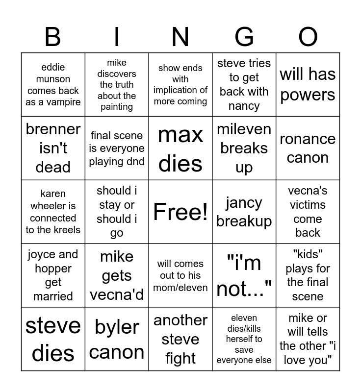 This bingo card has a free space and 24 words: mike gets vecna'd, byler canon, max dies, steve dies, will has powers, eddie munson comes back as a vampire, brenner isn't dead, mike discovers the truth about the painting, jancy breakup, will comes out to his mom/eleven, mileven breaks up, karen wheeler is connected to the kreels, "i'm not...", "kids" plays for the final scene, final scene is everyone playing dnd, eleven dies/kills herself to save everyone else, vecna's victims come back, show ends with implication of more coming, ronance canon, should i stay or should i go, mike or will tells the other "i love you", joyce and hopper get married, steve tries to get back with nancy and another steve fight.