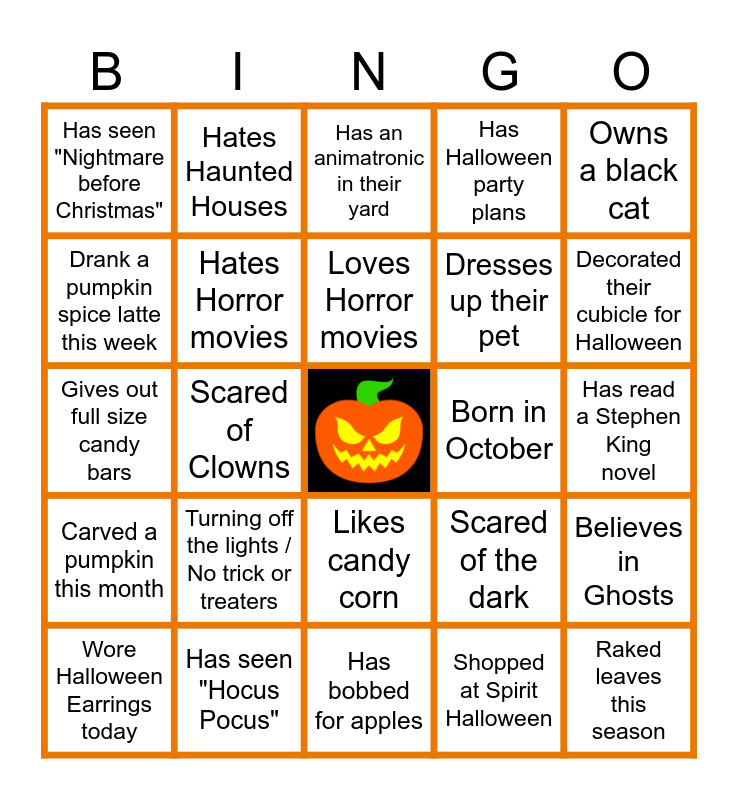 This bingo card has a free space and 24 words: Turning off the lights / No trick or treaters, Has seen "Hocus Pocus", Loves Horror movies, Wore Halloween Earrings today, Owns a black cat, Has seen "Nightmare before Christmas", Drank a pumpkin spice latte this week, Hates Haunted Houses, Born in October, Likes candy corn, Dresses up their pet, Gives out full size candy bars, Scared of the dark, Believes in Ghosts, Hates Horror movies, Shopped at Spirit Halloween, Has read a Stephen King novel, Has an animatronic in their yard, Decorated their cubicle for Halloween, Scared of Clowns, Raked leaves this season, Carved a pumpkin this month, Has Halloween party plans and Has bobbed for apples.