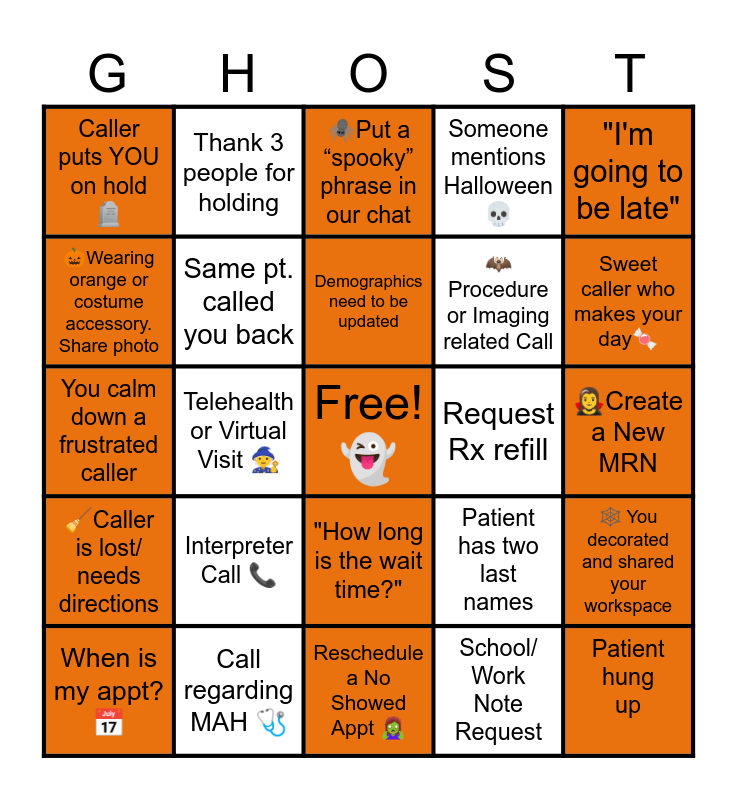 This bingo card has a free space and 24 words: When is my appt? 📅, Interpreter Call 📞, Demographics need to be updated, School/ Work Note Request, "I'm going to be late", Caller puts YOU on hold 🪦, Thank 3 people for holding, 🕷️Put a “spooky” phrase in our chat, Request Rx refill, 🧛♀️Create a New MRN, You calm down a frustrated caller, Same pt. called you back, Patient has two last names, 🕸️ You decorated and shared your workspace, 🎃Wearing orange or costume accessory. Share photo, Call regarding MAH 🩺, Reschedule a No Showed Appt 🧟♀️, Someone mentions Halloween 💀, Sweet caller who makes your day🍬, 🧹Caller is lost/ needs directions, Telehealth or Virtual Visit 🧙, "How long is the wait time?", 🦇Procedure or Imaging related Call and Patient hung up.