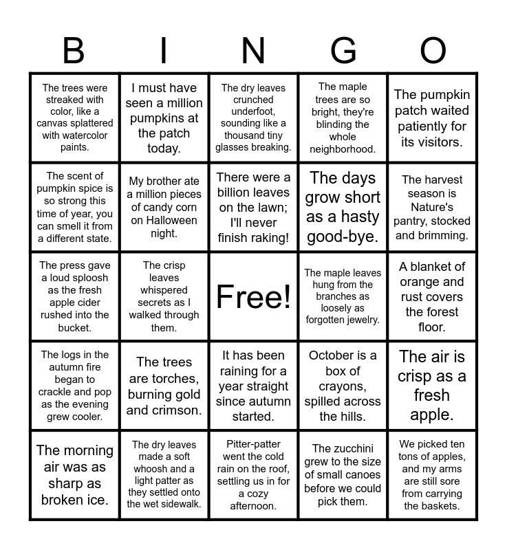 This bingo card has a free space and 24 words: The trees are torches, burning gold and crimson., The dry leaves made a soft whoosh and a light patter as they settled onto the wet sidewalk., There were a billion leaves on the lawn; I'll never finish raking!, The morning air was as sharp as broken ice., The pumpkin patch waited patiently for its visitors., The trees were streaked with color, like a canvas splattered with watercolor paints., The scent of pumpkin spice is so strong this time of year, you can smell it from a different state., I must have seen a million pumpkins at the patch today., The maple leaves hung from the branches as loosely as forgotten jewelry., It has been raining for a year straight since autumn started., The days grow short as a hasty good-bye., The press gave a loud sploosh as the fresh apple cider rushed into the bucket., October is a box of crayons, spilled across the hills., The air is crisp as a fresh apple., My brother ate a million pieces of candy corn on Halloween night., The zucchini grew to the size of small canoes before we could pick them., A blanket of orange and rust covers the forest floor., The dry leaves crunched underfoot, sounding like a thousand tiny glasses breaking., The harvest season is Nature's pantry, stocked and brimming., The crisp leaves whispered secrets as I walked through them., We picked ten tons of apples, and my arms are still sore from carrying the baskets., The logs in the autumn fire began to crackle and pop as the evening grew cooler., The maple trees are so bright, they're blinding the whole neighborhood. and Pitter-patter went the cold rain on the roof, settling us in for a cozy afternoon..