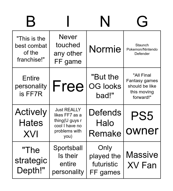 This bingo card has 16 words: Sportsball Is their entire personality, PS5 owner, Normie, "This is the best combat of the franchise!", Actively Hates XVI, Never touched any other FF game, Defends Halo Remake, Only played the futuristic FF games, Entire personality is FF7R, Free, "The strategic Depth!", Staunch Pokemon/Nintendo Defender, Just REALLY likes FF7 as a thing(U guys r cool I have no problems with you), "All Final Fantasy games should be like this moving forward!", "But the OG looks bad!" and Massive XV Fan.