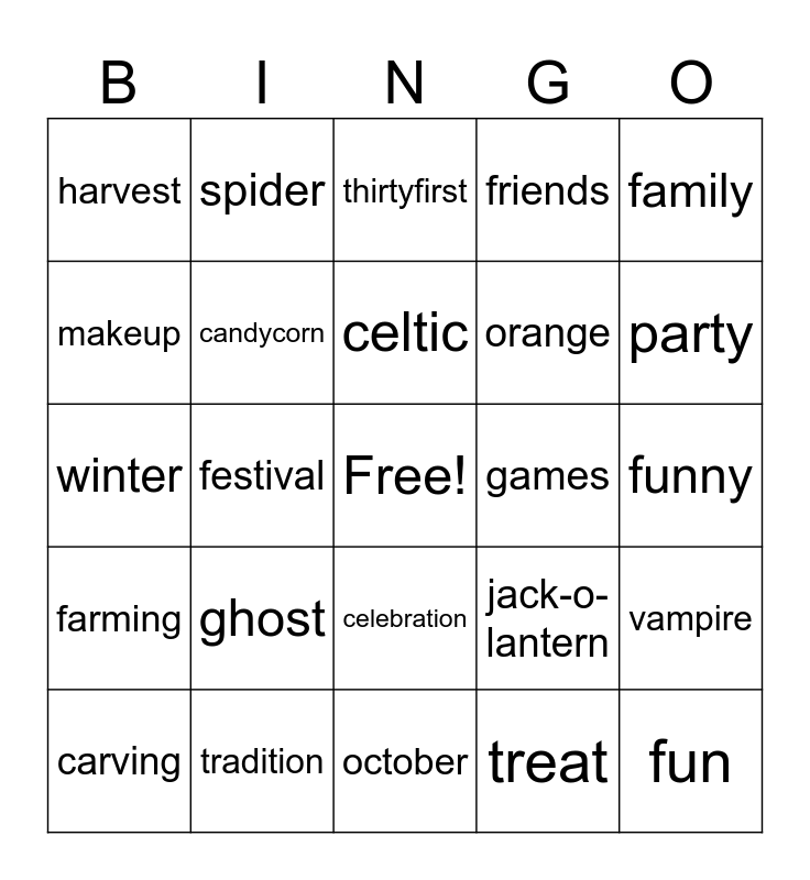 This bingo card has a free space and 39 words: bat, black, candy, candycorn, carving, celebration, celtic, costume, family, farming, festival, friends, fun, funny, games, ghost, halloween, harvest, haunted house, jack-o-lantern, makeup, october, orange, party, pizza, pumpkin, purple, scary, skeleton, spider, spider web, summer, thirtyfirst, tradition, treat, trick, vampire, winter and witch.