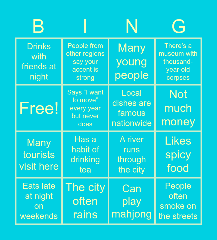 This bingo card has 16 words: The city often rains, Likes spicy food, Many young people, Drinks with friends at night, Many tourists visit here, People from other regions say your accent is strong, A river runs through the city, Can play mahjong, Free!, Says “I want to move” every year but never does, Eats late at night on weekends, There’s a museum with thousand-year-old corpses, Has a habit of drinking tea, Not much money, Local dishes are famous nationwide and People often smoke on the streets.