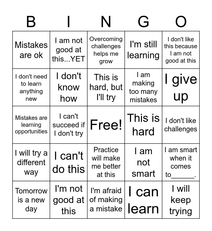 This bingo card has a free space and 24 words: I can't do this, I'm not good at this, This is hard, but I'll try, Tomorrow is a new day, I don't like this because I am not good at this, Mistakes are ok, I don't need to learn anything new, I am not good at this...YET, This is hard, Practice will make me better at this, I am making too many mistakes, Mistakes are learning opportunities, I am not smart, I am smart when it comes to______., I don't know how, I can learn, I don't like challenges, Overcoming challenges helps me grow, I give up, I can't succeed if I don't try, I will keep trying, I will try a different way, I'm still learning and I'm afraid of making a mistake.