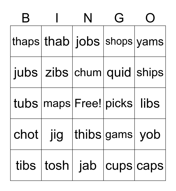 This bingo card has a free space and 29 words: tibs, cobs, maps, whim, thaps, jobs, zibs, jig, picks, tosh, libs, caps, jab, cups, ships, jams, thibs, chot, yams, tubs, gams, chap, quid, jubs, shops, thab, yob, chum and lobs.