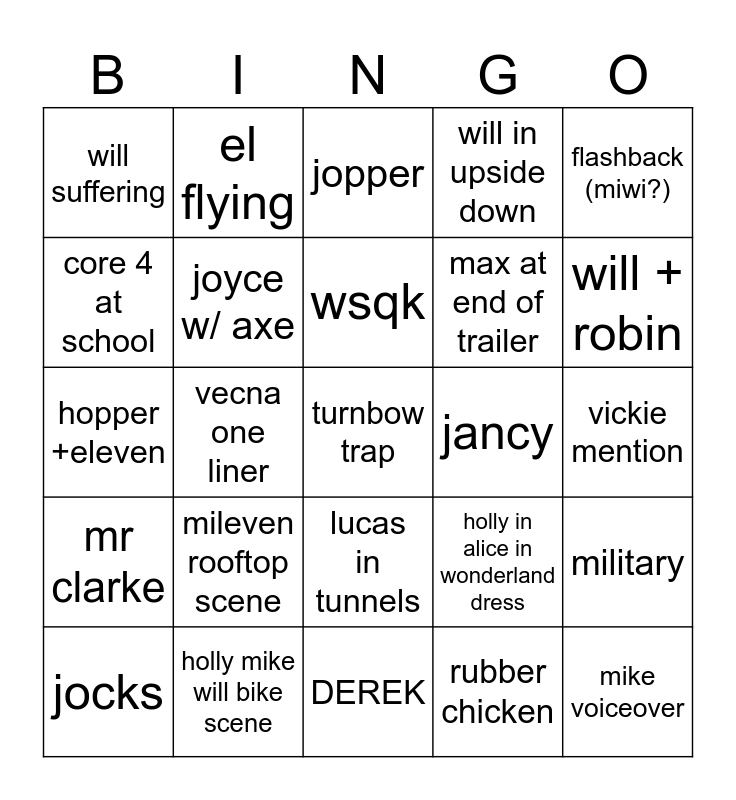 This bingo card has a free space and 24 words: mileven rooftop scene, holly mike will bike scene, wsqk, jocks, flashback (miwi?), will suffering, core 4 at school, el flying, jancy, lucas in tunnels, max at end of trailer, hopper +eleven, holly in alice in wonderland dress, military, joyce w/ axe, rubber chicken, vickie mention, jopper, will + robin, vecna one liner, mike voiceover, mr clarke, will in upside down and DEREK.