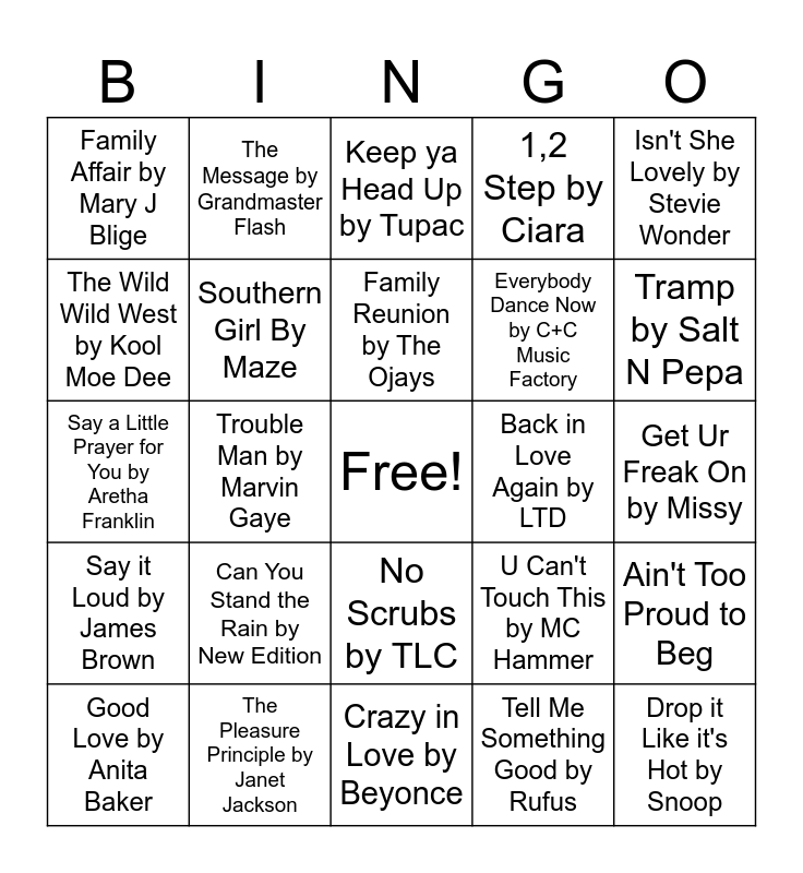 This bingo card has a free space and 34 words: What's Going On by Marvin Gaye, Tell Me Something Good by Rufus, Rhythm of the Night by DeBarge, Supersonic by JJ Fad, Say it Loud by James Brown, Southern Girl By Maze, Isn't She Lovely by Stevie Wonder, Good Love by Anita Baker, The Message by Grandmaster Flash, I'm Bad by LL Cool J, Family Reunion by The Ojays, Keep ya Head Up by Tupac, Ladies First by Queen Latifah, Children's Story by Slick Rick, Back in Love Again by LTD, Tramp by Salt N Pepa, The Pleasure Principle by Janet Jackson, Say a Little Prayer for You by Aretha Franklin, Can You Stand the Rain by New Edition, U Can't Touch This by MC Hammer, No Scrubs by TLC, Gotta be Starting Something, Family Affair by Mary J Blige, Get Ur Freak On by Missy, Crazy in Love by Beyonce, Drop it Like it's Hot by Snoop, 1,2 Step by Ciara, Say My Name by Destiny's Child, Everybody Dance Now by C+C Music Factory, The Wild Wild West by Kool Moe Dee, Tear the Roof Off the Sucka by P-Funk, Trouble Man by Marvin Gaye, Ain't Too Proud to Beg and It Never Rains in Southern California.