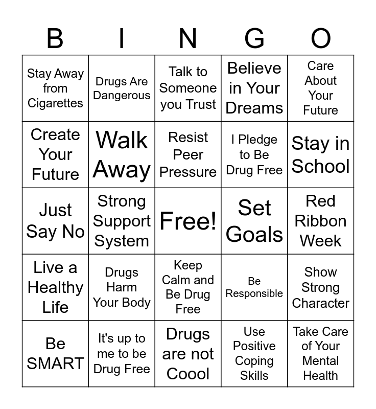 This bingo card has a free space and 24 words: Drugs Harm Your Body, It's up to me to be Drug Free, Resist Peer Pressure, Be SMART, Care About Your Future, Stay Away from Cigarettes, Create Your Future, Drugs Are Dangerous, Set Goals, Keep Calm and Be Drug Free, I Pledge to Be Drug Free, Just Say No, Be Responsible, Show Strong Character, Walk Away, Use Positive Coping Skills, Red Ribbon Week, Talk to Someone you Trust, Stay in School, Strong Support System, Take Care of Your Mental Health, Live a Healthy Life, Believe in Your Dreams and Drugs are not Coool.