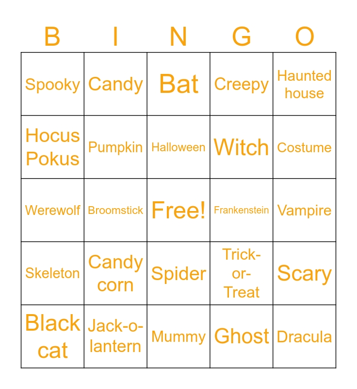 This bingo card has a free space and 24 words: Black cat, Candy corn, Halloween, Ghost, Haunted house, Spooky, Candy, Bat, Frankenstein, Vampire, Werewolf, Pumpkin, Trick-or-Treat, Scary, Hocus Pokus, Jack-o-lantern, Mummy, Creepy, Costume, Skeleton, Broomstick, Spider, Witch and Dracula.