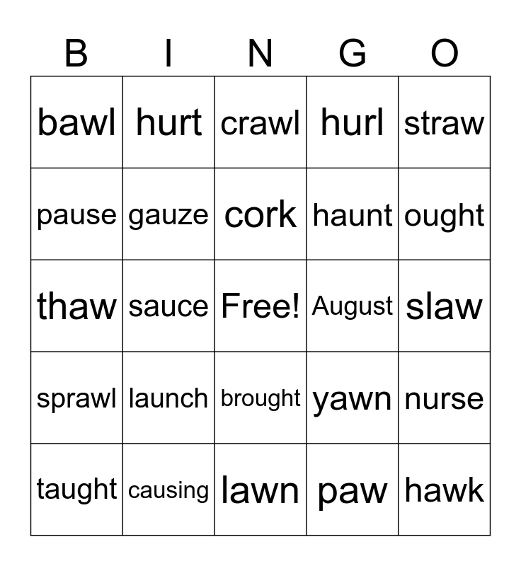 This bingo card has a free space and 29 words: taught, caught, sauce, sought, bawl, crawl, gauze, launch, August, causing, slaw, hawk, lawn, paw, ought, thought, brought, sprawl, straw, thaw, yawn, fought, haunt, pause, hurl, hurt, nurse, cork and normal.