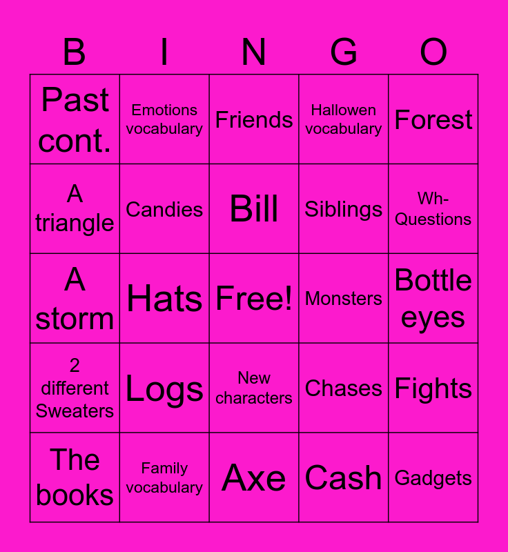This bingo card has a free space and 24 words: Logs, Family vocabulary, Bill, The books, Forest, Past cont., A triangle, Emotions vocabulary, Monsters, New characters, Siblings, A storm, Chases, Fights, Candies, Cash, Bottle eyes, Friends, Wh-Questions, Hats, Gadgets, 2 different Sweaters, Hallowen vocabulary and Axe.