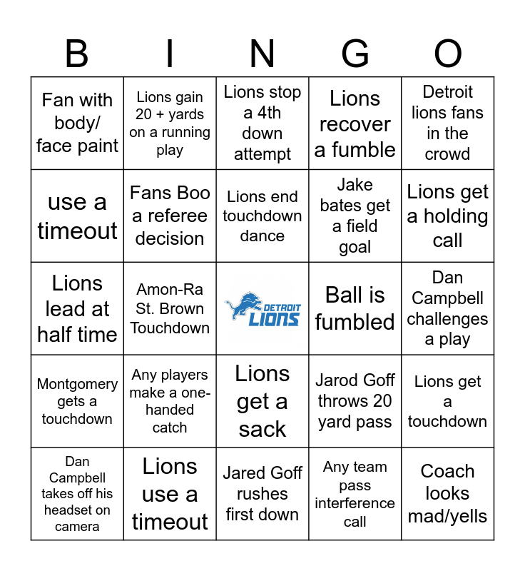 This bingo card has a free space and 29 words: Dan Campbell takes off his headset on camera, Lions get a first down, Amon-Ra St. Brown Touchdown, Lions get an offside call, Fan with body/ face paint, Lions stop a 4th down attempt, Fans Boo a referee decision, Any players make a one- handed catch, Ball is fumbled, Lions use a timeout, Dan Campbell challenges a play, Coach looks mad/yells, Jared Goff rushes first down, Any team pass interference call, Lions get a holding call, Any player injury timeout, Lions get a sack, Montgomery gets a touchdown, Detroit lions fans in the crowd, Lions lead at half time, Jarod Goff throws 20 yard pass, Lions defence gets an interception, Jake bates get a field goal, use a timeout, Lions recover a fumble, Lions gain 20 + yards on a running play, Lions get a touchdown, Lions end touchdown dance and Jarod Goff throws a 10 + yard pass.