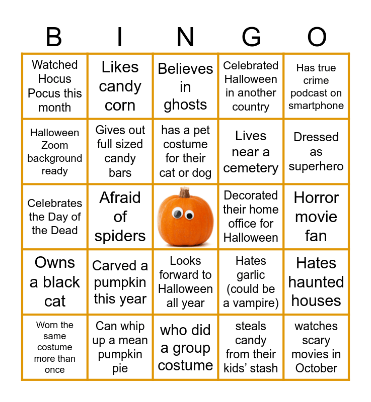 This bingo card has a free space and 24 words: Carved a pumpkin this year, Can whip up a mean pumpkin pie, has a pet costume for their cat or dog, Worn the same costume more than once, Has true crime podcast on smartphone, Watched Hocus Pocus this month, Halloween Zoom background ready, Likes candy corn, Decorated their home office for Halloween, Looks forward to Halloween all year, Lives near a cemetery, Celebrates the Day of the Dead, Hates garlic (could be a vampire), Hates haunted houses, Gives out full sized candy bars, steals candy from their kids’ stash, Horror movie fan, Believes in ghosts, Dressed as superhero, Afraid of spiders, watches scary movies in October, Owns a black cat, Celebrated Halloween in another country and who did a group costume.
