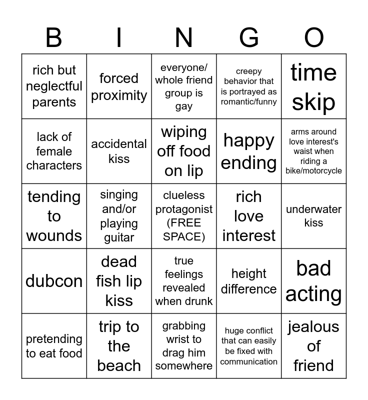 This bingo card has a free space and 30 words: trip to the beach, sleeping with the lights on, singing and/or playing guitar, tragic back story, rich but neglectful parents, everyone/ whole friend group is gay, accidental kiss, true feelings revealed when drunk, rich love interest, grabbing wrist to drag him somewhere, underwater kiss, jealous of friend, huge conflict that can easily be fixed with communication, enemies to lovers, arms around love interest's waist when riding a bike/motorcycle, "its okay, were both guys", height difference, dubcon, dead fish lip kiss, time skip, tending to wounds, childhood friends, forced proximity, happy ending, lack of female characters, creepy behavior that is portrayed as romantic/funny, bad acting, pretending to eat food, wiping off food on lip and random mention of a character's attractiveness.