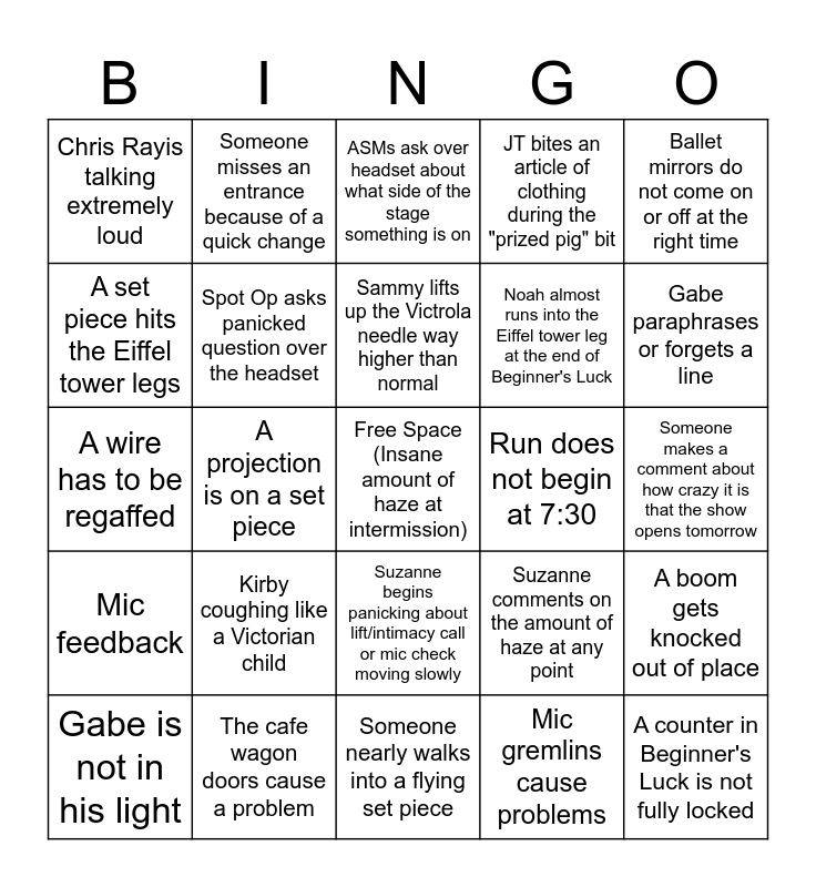 This bingo card has a free space and 24 words: Kirby coughing like a Victorian child, The cafe wagon doors cause a problem, Sammy lifts up the Victrola needle way higher than normal, Gabe is not in his light, Ballet mirrors do not come on or off at the right time, Chris Rayis talking extremely loud, A set piece hits the Eiffel tower legs, Someone misses an entrance because of a quick change, Run does not begin at 7:30, Suzanne begins panicking about lift/intimacy call or mic check moving slowly, Noah almost runs into the Eiffel tower leg at the end of Beginner's Luck, A wire has to be regaffed, Suzanne comments on the amount of haze at any point, A boom gets knocked out of place, Spot Op asks panicked question over the headset, Mic gremlins cause problems, Someone makes a comment about how crazy it is that the show opens tomorrow, ASMs ask over headset about what side of the stage something is on, Gabe paraphrases or forgets a line, A projection is on a set piece, A counter in Beginner's Luck is not fully locked, Mic feedback, JT bites an article of clothing during the "prized pig" bit and Someone nearly walks into a flying set piece.