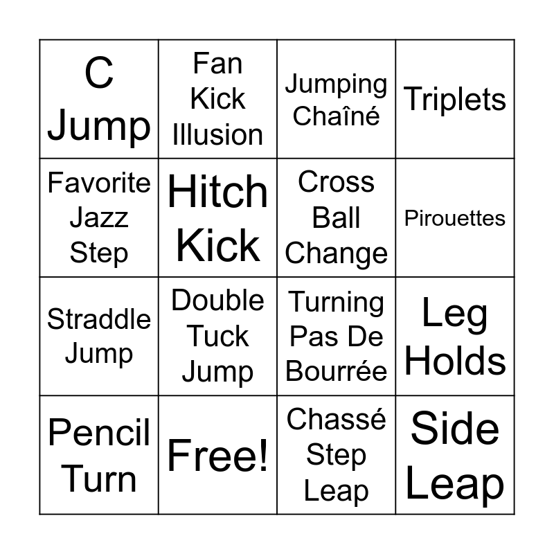 This bingo card has 16 words: Free!, Leg Holds, Jumping Chaîné, C Jump, Straddle Jump, Fan Kick Illusion, Turning Pas De Bourrée, Chassé Step Leap, Favorite Jazz Step, Hitch Kick, Pencil Turn, Triplets, Double Tuck Jump, Pirouettes, Cross Ball Change and Side Leap.
