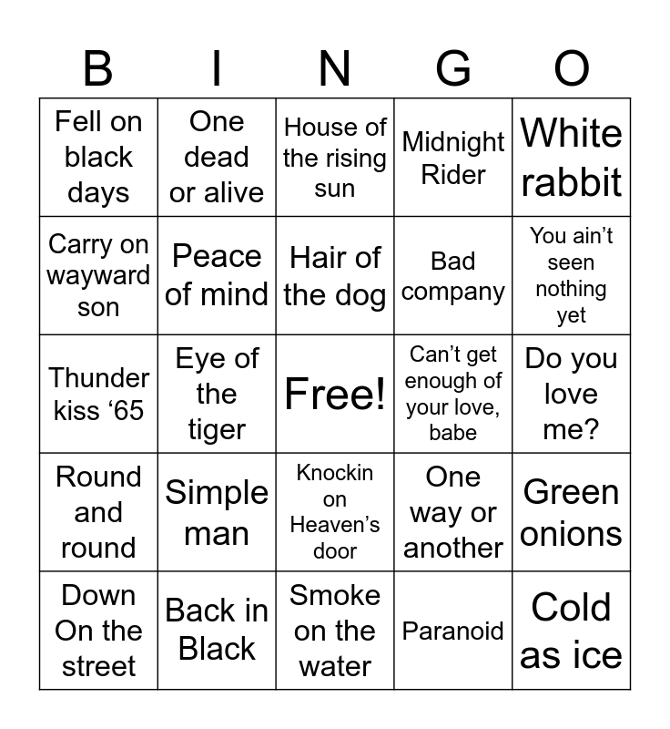This bingo card has a free space and 59 words: Night moves, Back in Black, Fly by night, Round and round, Paranoid, Rock of ages, Peace of mind, No one like you, Bad company, Rocky Mountain Way, Midnight Rider, Burnin for you, Carry on wayward son, Stranglehold, Time has come today, Fell on black days, Cold as ice, White rabbit, Renegade, Hair of the dog, Can’t get enough of your love, babe, House of the rising sun, Down On the street, Green onions, Rooster, Saturday night special, Foreplay/long time, Don’t look back, You ain’t seen nothing yet, Run through the jungle, I put a spell on you, Long train runnin‘, Heat of the moment, It’s my party, One dead or alive, You shook me all night long, Lonely is the night, Eye of the tiger, Ready for love, Thunder kiss ‘65, Thunderstruck, Simple man, Do you love me?, Won’t get fooled again, Oye Como Va, Rock ‘n’ roll never forgets, Cherry pie, Life’s been good, Knockin on Heaven’s door, Smoke on the water, The gambler, Flirtin with disaster, Space oddity, A new day yesterday, Love hurts, One way or another, You sexy thing, Play with fire and Slow ride.