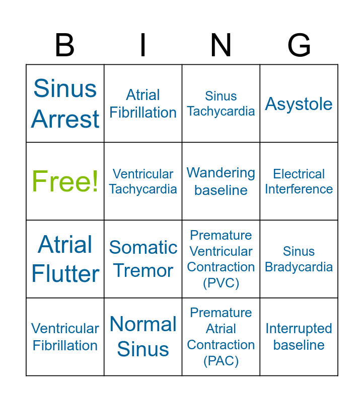 This bingo card has 16 words: Normal Sinus, Sinus Bradycardia, Sinus Tachycardia, Sinus Arrest, Atrial Flutter, Atrial Fibrillation, Premature Ventricular Contraction (PVC), Premature Atrial Contraction (PAC), Free!, Ventricular Tachycardia, Ventricular Fibrillation, Asystole, Somatic Tremor, Electrical Interference, Wandering baseline and Interrupted baseline.
