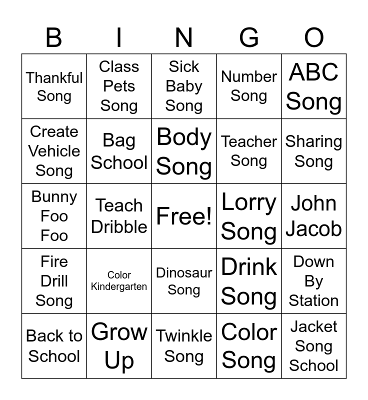 This bingo card has a free space and 64 words: Wave Song, Napster, Happy Know, Down By Station, Lunch Song, According Happen, Class Pets Song, Hello Song, Body Song, Monkey Jumping Bed, Dinosaur Song, Guess Animal Song, John Jacob, ABC Song, Route Song New Year, Create Vehicle Song, Teach Dribble, Thankful Song, Clean Up Song, Teacher Song, Color Kindergarten, Fire Drill Song, Number Song, Jelly Color Song, Fold Song, Stick It To, Play and Tell, Winter Show Tell, More We Together, Nap Time Song, Music Song, Garden Song, Harvest Stew, Funny Face Song, Sharing Song, Back to School, Box Song, Color Song, Bridge Song, Bag School, Bunny Foo Foo, Lorry Song, Pet Care, Checkup Song, Humpty Dumpty, Jacket Song School, Grow Up, Sand Song, Drink Song, Cake Song, Muffin Song, Stretching Exercise, Twinkle Song, Fire Engine, Dancing Song Tap, Building Song, Sick Baby Song, Five Senses, Hand Shoulder Knee Toe, Boo Boo Song, Play Wheels Of The Bus, Wheels Bus, Swish Wipe Song and Bingo Farm Dog Song.