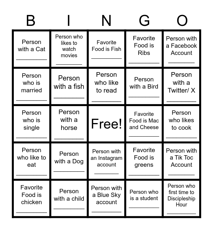 This bingo card has a free space and 24 words: Person with a Dog _________, Person with a child _________, Person who like to read ________, Favorite Food is chicken _________, Person with a Facebook Account ________, Person with a Cat _________, Person who is married _________, Person who likes to watch movies _________, Favorite Food is Mac and Cheese __________, Person with an Instagram account ________, Person with a Bird _________, Person who is single _________, Favorite Food is greens _________, Person with a Tik Toc Account ________, Person with a fish ________, Person who is a student __________, Person who likes to cook _________, Favorite Food is Fish __________, Person with a Twitter/ X ________, Person with a horse ________, Person who first time to Discipleship Hour __________, Person who like to eat _________, Favorite Food is Ribs _________ and Person with a Blue Sky account _________.